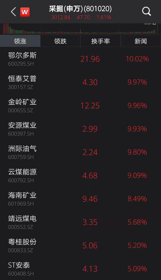 采掘板块中,鄂尔多斯、恒泰艾普、金岭矿业、安源煤业、洲际油气涨停;