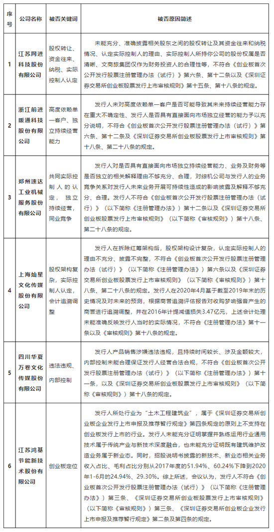 如创业板被否的江苏鸿基节能新技术股份有限公司,其被否的原因之一为“发行人所处行业为“土木工程建筑业”,属于《深圳证券交易所创业板企业发行上市申报及推荐暂行规定》第四条规定的原则上不支持在创业板发行上市的行业。发行人未能充分证明掌握并熟练运用行业通用技术属于传统产业与新技术深度融合,也未能充分证明既有建筑维护改造业务属于新业态。”