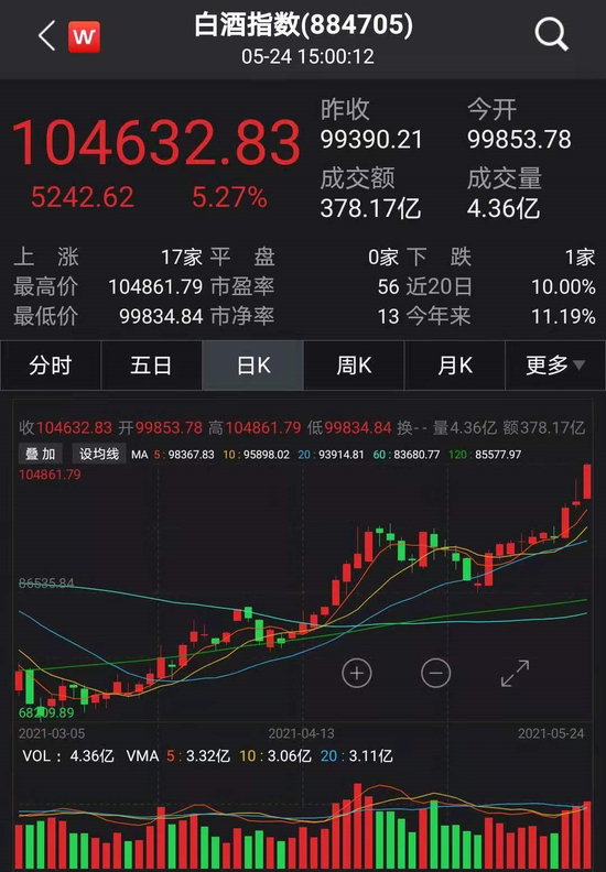 不过从行业板块表现看,近期持续反弹的白酒股堪称今日市场“C位”。Wind数据显示,白酒指数今日大涨5.27%(指数盘中一度触及104861.79点),不仅创下最近4个月来单日最大涨幅,也打破此前1月创下的纪录,再创历史新高。经历年初的剧烈回调后,3月10日至今,白酒板块持续反弹,截至5月24日收盘累计涨幅已超过51%。