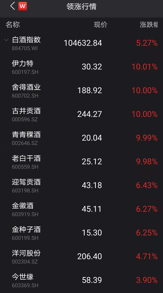从个股看,今日伊力特、舍得酒业、古井贡酒、青青稞酒、老白干酒集体涨停,迎驾贡酒、金徽酒、金种子酒等二线白酒龙头跟涨逾6%;舍得酒业、水井坊今日盘中股价均创出历史新高,其最新总市值均在600亿元以上。