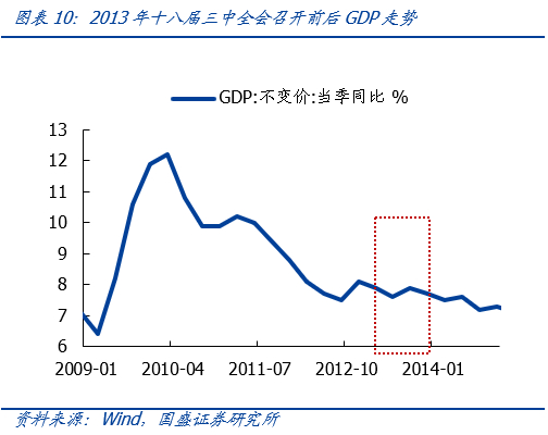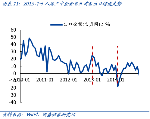 十八届三中全会召开前经济经历长期下滑后迎来阶段性企稳与弱复苏。经历2012年经济下滑后,下半年流动性全面放松带来经济企稳,2013年增长中枢逐步稳定在7.8%上下,全年PMI震荡上行。但上一轮房地产+基建的刺激周期逐渐走向尾声,消费增长乏力,全球需求不足导致出口出现急剧下滑,旧动能效用减弱,新动能亟需发展壮大。