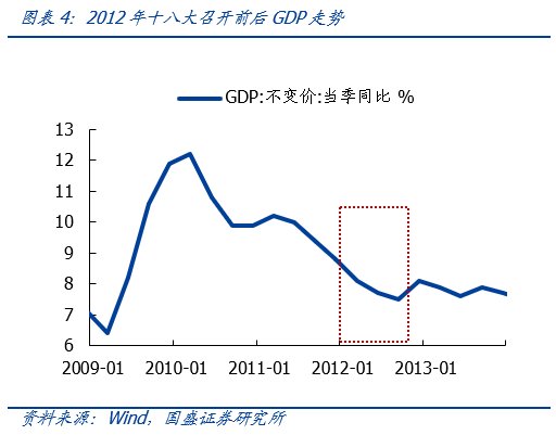 十八大召开前GDP增速正在经历断崖下滑。四万亿刺激后,国内GDP增速持续下台阶,放水刺激下的经济复苏止步于2011年上半年,从2011年下半年开始国内经济增速 “破十”后快速下行,2011年四季度GDP已经滑落至8.8%。2012年经济动能再度衰退“破八”,四个季度GDP增速分别是8.1%、7.7%、7.5%、8.1%。十八大召开前宏观经济面临着增速彻底告别两位数增长且不断下台阶的情况,经济形势较为严峻。