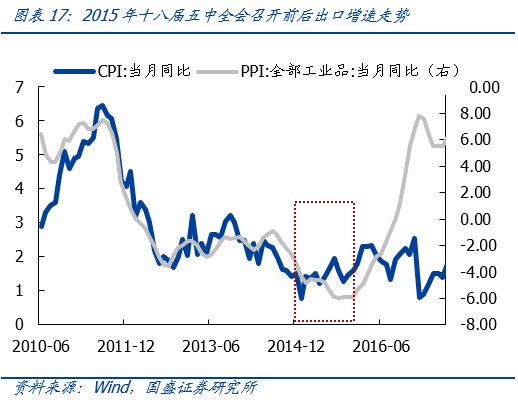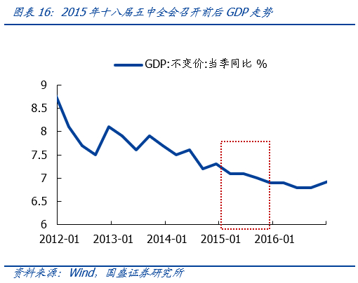 十八届五中全会召开前经济经历快速下台阶。2014年下半年开始,经济增速持续下滑,2015年四个季度GDP分别是7.1%、7.1%、7.0%、6.9%,下半年开始正式破“7”。与此同时,经济陷入通缩之中,CPI从2014年3月的2.38%下行至年底的1.51%,2015年初更是进一步下行到了0.76%,创5年新低,PPI从2014年3月的-2.3%滑向了年底的-3.32%,并且整个2015年间PPI仍在持续下滑,到2015年底时下滑至-5.9%的更深度通缩水平。