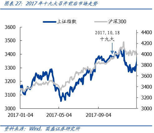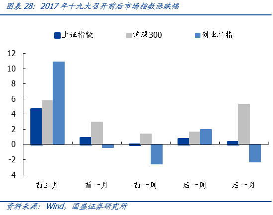 十九大召开之前,市场延续5月以来上涨趋势,临近会议前市场转为震荡。2017年10月18日十九大召开前三月、前一月、前一周上证指数涨跌幅分别是4.67%、0.84%、-0.04%。具体来看,5月以来由于去产能与环保限产导致商品价格大幅上涨,周期股带领大盘持续反弹。9月起市场步入震荡,直至会议召开。但十九大召开后一定程度上提振了市场情绪,会议召开后一个周及一个月市场均实现上涨。