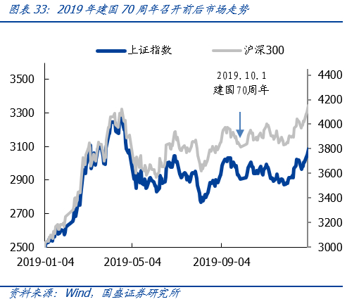 2019年建国70周年前经济下行压力加大,国内GDP下滑至6%以下,全球经济共振衰退,同时全年受中美贸易摩擦反复扰动,全年流动性宽松,2019年央行连续降准“降息”。建国70周年庆典前,9月降准,8月与9月相继下调LPR,宽松力度进一步加大。