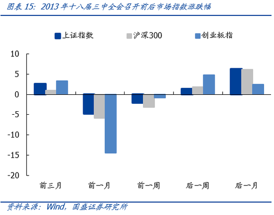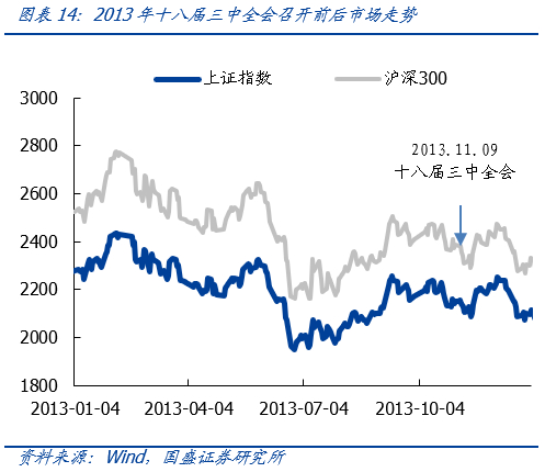 十八届三中全会召开之前,市场正处于“钱荒”之后的反弹期,但临近大会召开,市场受流动性冲击再度转向下跌,市场仍以震荡为主。2013年11月9日十八届三中全会召开前三月、前一月、前一周上证指数涨跌幅分别是2.63%、-4.78%、-2.02%。具体来看,6月“钱荒”冲击下市场大幅下跌,随着央行维稳与利率回落,市场从6月底反弹至10月22日前后。这主要是由于10月20日前后Shibor利率再次创6月以来新高,1年期国债利率也创近5年新高,10月小“钱荒”再起,市场转入下跌,本轮“献礼行情”也由此终结。但十八大全会召开后,政策超预期下市场迎来新一轮上涨行情。11月12日晚间,十八届三中全会公报发布,市场认为公报内容低于会前预期,次日股市应声下跌,上证综指跌幅达1.83%,失守2100点关口。但11月15日公布的《中共中央关于全面深化改革若干重大问题的决定》则大超市场预期,市场从11月中旬一直上涨至12月4日。