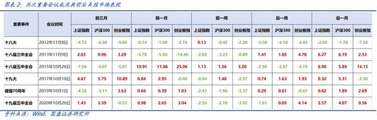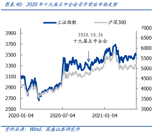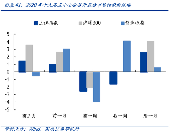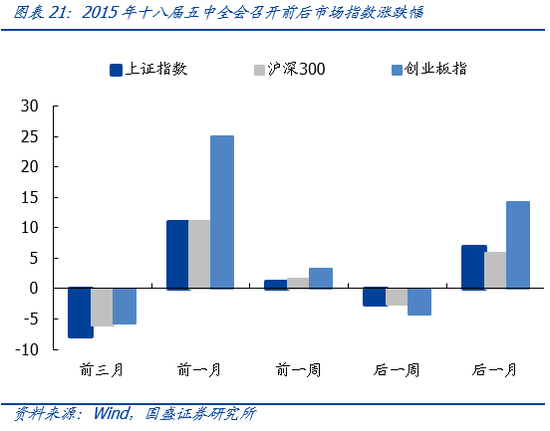 十八届五中全会召开之前,市场正处于2015年股灾后的反弹期,临近会议前市场大幅上涨。2015年11月8日十八届五中全会召开前前三月、前一月、前一周上证指数涨跌幅分别是-7.94%、10.91%、1.13%。具体来看,2015年6月至8月股市大跌后,随着降息降准带来流动性进一步宽松,国家队救市、IPO暂停等呵护政策下,8月底市场企稳。国庆节后归来10月8日起市场迎来反弹,本轮“献礼行情”的上涨行情持续到十八届五中全会召开当天。会议召开期间,市场横盘震荡、小幅下跌,此后11月初大盘爆发再度站上3600点,但此后步入横盘震荡,宣告本轮行情结束。