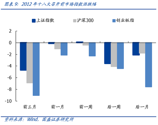 十八大召开之前,市场先上后下,市场以震荡为主。2012年11月8日十八大召开前三月、前一月、前一周上证指数涨跌幅分别是-4.72%、-0.14%、0.13%。具体来看,受经济大幅下滑冲击,市场从2012年5月开始单向下行,随着新一轮刺激政策出台,9月底市场企稳后震荡上行,临近十八大召开前,市场震荡加剧。本次“献礼行情”终于十八大召开当日,此后市场开始持续下行,十八大召开后一周、后一月上证指数涨跌幅为-3.58%、-2.09%,直至12月初触底反弹。