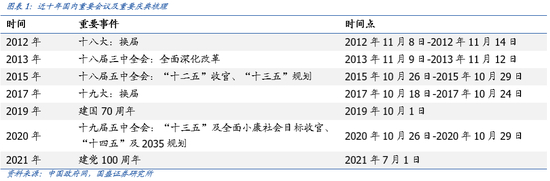 我们梳理了近十年国内六次重要的会议或庆典活动。分别是2012年十八大(换届)、2013年十八届三中全会(以习近平同志为核心的党中央推进全面深化改革)、2015年十八届五中全会(“十二五”收官、“十三五”规划)、2017年十九大(换届)、2019年建国70周年、2020年十九届五中全会(“十三五”及全面小康社会收官、“十四五”及2035规划)。