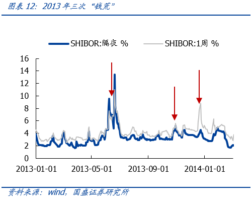 多次“钱荒”的爆发,令流动性雪上加霜。2013年货币政策定力十足,全年无降准、无降息,M2与社融自年中开始逐步回落,10年国债收益率自4月开始大幅上行,从年初3.5%涨至年末4.5%左右。2013年6月货币市场出现“钱荒”。6月以来货币市场利率便开始上行,6月18日央行发行20亿央票,隔夜Shibor上涨78.3BP至5.60% ,6月20日Shibor全线上涨,隔夜SHIBOR上涨578BP,达到13.44%,创下历史新高。此后央行通过SLF等向一些金融机构提供流动性支持,并促使一些自身流动性充足的银行向市场融出资金,6月末货币市场利率逐步回落,“钱荒”基本结束。下半年10月和12月又经历两次小“钱荒”。十八届三中全会召开前,市场正在经历10月以来的小“钱荒”。