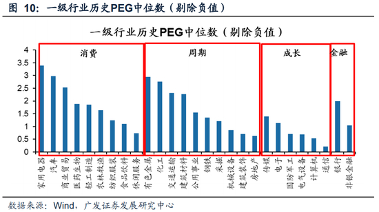 如上文所述,不同类型行业的PEG中枢往往不同,因此使用恒定的PEG判定阈值容易产生对某些行业的“高估”或者“低估”,因此我们需要针对不同的品种设定其对应的PEG筛选阈值。“PEG≤1”策略是基于美国80-90年代下的的一个经验法则,而非恒定真理。在A股的具体运用当中,传统PEG方法更容易纳入银行、地产等PEG中枢较低的行业,同时更容易剔除掉一些PEG中枢较高的消费行业。因此,为提高PEG选股策略的普适性,我们对于不同类型的行业定不同的PEG中枢,从而筛选出真正的“估值和业绩匹配”的企业。具体方法上,由于我们使用的是动态的盈利和动态的估值测算的PEG,因此在为一级行业设定PEG中枢的时候我们均使用行业的动态估值和动态盈利计算。运用申万一级行业的动态盈利和动态估值计算2010年以来的行业PEG,采用动态PEG非负中位数确定一级行业的PEG判定阈值。与行业的历史PEG往往大于1不同,部分行业的动态估值和动态盈利下计算出来的PEG中枢会出现低于1的情况。