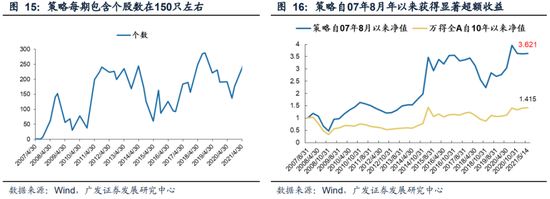 优化的PEG策略在应用中具备2大特性:一是信用收缩过程中大概率获得较为显著的超额收益,二是自07年8月以来相较万得全A获得明显的超额收益。自2007年8月以来,优化的PEG策略所筛选出的个股数量开始呈现较为稳定的态势,每期可选入个股数在50-300个之间,均值约在150只左右。因此优化的PEG策略可以构建稳定的组合进行07年8月以来的收益率回溯。通过回溯可以发现:(1)无论是从M1同比增速下行的角度还是社融增速下行的角度来说,在引用收缩期间,优化的PEG策略均大概率能获得较为显著的超额收益;(2)优化的PEG策略自07年8月至今累计净值为3.62,同期万得全A累计净值为1.41,策略相较万得全A获得了显著的超额收益。