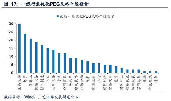 调整后的动态PEG判定阈值更具普适性,能够克服传统PEG选股策略的弊端。一方面,市场盈利定价较低的行业如银行、地产及部分周期性行业,天然PEG较低,简单用PEG<1筛选个股容易陷入“估值陷阱”;另一方面,盈利稳定、波动性较小的行业(如食品饮料、休闲服务等消费行业),以及未来成长性较高行业(如通信、计算机等),往往具有较高的PEG中枢,如用PEG<1的传统策略进行筛选则容易错失优质企业。因此,通过行业的动态估值和动态盈利计算所得的动态PEG中枢,适用不同类型行业均有相当针对性,普适性更强,选股效果更佳。具体的行业调整后的PEG阈值标准如下图: