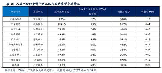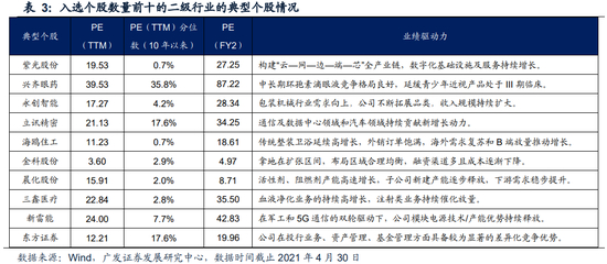 行业特征:从一级行业数量看,策略最新一期调仓后(21年4月末)个股数量前五的行业是医药生物、电子、计算机、机械设备、轻工制造。从更为细分的二级行业看,个股数量前十的行业是计算机应用、化学制药、专用设备、电子制造、家用轻工、房地产开发、化学制品、医疗器械、电源设备、证券。策略最新一期入选个股名单请联系广发策略或对口销售。
