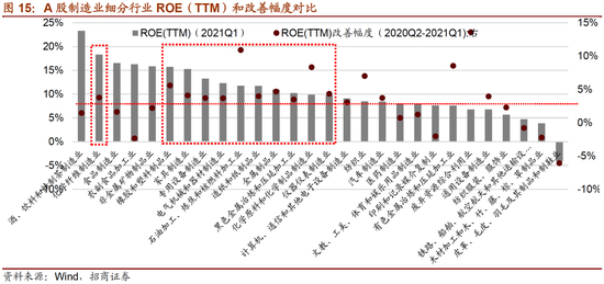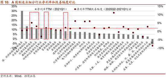 目前制造业ROE(TTM)上行至10.8%(2021Q1),高于整体A股(剔除金融石油石化)1.8个百分点。制造业产能利用率仍有一定的修复空间,同时企业利润仍在持续释放中,预计在未来2-3个季度内,净利率和总资产周转率提升将会继续推动制造业ROE上行。