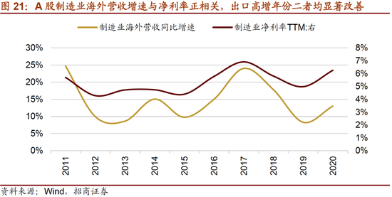 ⚑中国制造业增加值在全球范围内领先,同时A股制造业海外营收规模持续扩张,且出口规模增速与净利率具有较强的正相关性。由于2021年A股制造业出口有望延续扩张态势,海外营收占比可能会进一步提升。TMT制造、家具制造、电气机械和器材制造、化学原料和化学制品制造、专用设备制造、汽车制造、通用设备制造、仪器仪表制造、化学纤维制造业等行业出口规模较大、海外营收规模扩张较快、且出口产品具有较强的竞争力。
