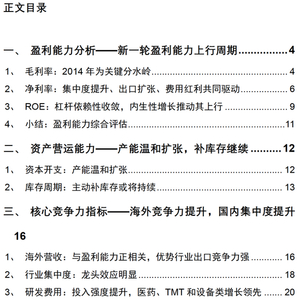 第一,传统制造业产能过剩问题得到解决。2015年前后煤炭、金属冶炼加工等行业的资产负债率攀升至阶段性高点,高债务叠加经营亏损,部分煤炭、钢铁、有色企业接近破产的边缘。在供给侧改革引导下,传统行业淘汰落后产能、产品价格上扬、行业供需改善等等都为这些传统的周期品行业注入活力,资源品行业的资产杠杆也得到了有效的控制。从 2015年末以来,大宗商品价格明显提升,毛利率显著改善。第二,行业准入门槛提高。第三,规模效应下龙头企业议价能力提升。头部企业利用自身较大的产能优势可以以相对更低的成本进行生产,其盈利能力也相对较强。同时,部分龙头企业可以通过兼并收购中小企业的方式来做大做强,从而进一步提升行业集中度水平。