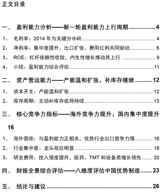 随着产品附加值提升,全球份额和国内集中度的提升,中国制造业的盈利能力进入新一轮上行周期。本文从A股制造业财务指标出发,评估盈利能力、营运能力、核心竞争力指标,为投资者呈现制造业财务指标全景图,并构建八维度评估体系筛选出竞争力较强的细分领域。