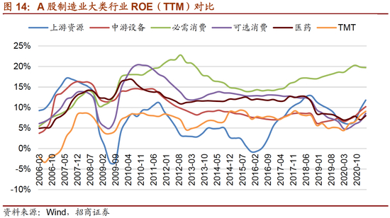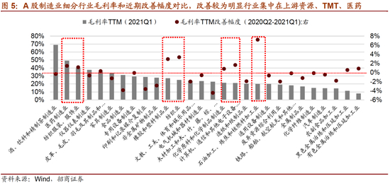 综合来看,2014年后A股制造业毛利率开启了向上修复的通道,上游资源、中游设备和必需消费毛利率均在此阶段开启提升,TMT制造毛利率则是在2019年初(新一轮科技上行周期开启)出现向上拐点。近期毛利率提升较为明显的行业集中在上游资源(量价齐升背景下成本相对固定)、TMT制造、医药制造、纺织服装等。