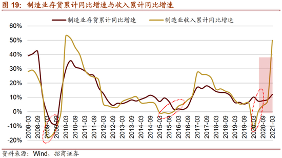 2005年至今A股制造业经历了四轮较为完整的库存周期,每一轮周期长度大约是40个月;由于企业进行库存管理的决策往往会略滞后于经济周期,因此制造业库存拐点的出现往往会略滞后于收入增速拐点,如2009年、2015年末、2020年均出现过类似的情形。2020年3月起制造业企业经历了较为短暂的被动补库存和主动去库存阶段,进入三季度后则是主动补库存阶段,收入增速和库存增速均处于上行通道,目前企业仍处于主动补库存阶段。