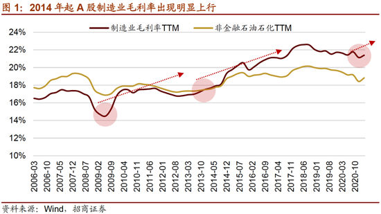 2014年为我国制造业毛利率变化的关键分水岭。2014年之前,A股制造业毛利率中枢大约为16.5%,除了次贷危机前后出现明显下滑以外,均保持相对稳定的状态;同时制造业毛利率中枢明显低于A股非金融石油石化板块的毛利率水平。2014年之后,A股制造业毛利率开启持续修复并且远远超过非金融石油石化板块毛利率,目前制造毛利率中枢大约为21%。