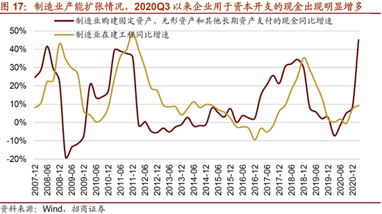 对于A股制造业而言,2006年至今经历过三轮较为完整的产能扩张周期,分别是2006-2008年(出口和地产双轮驱动)、2010-2012年(四万亿投放)、2017年-2018年(供给侧改革后落后产能出清)。目前制造业用于资本开支的现金增速于2020Q2走出底部并持续走高,在建工程增速于2020Q4开始明显回升。