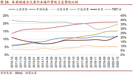 过去十年制造业海外营收占比提升幅度依次为可选消费(+9.6%)(主要依赖于汽车制造拉动)、中游设备(+7.2%)(主要依赖于电气机械和器材制造业拉动)、上游资源(+5.33%)(主要依赖于橡胶和塑料制品业、化学原料和化学制品制造业拉动)、必需消费(+1.7%)、医药(+0.81%)、TMT(-4.6%)。同时海外营收占比最高的行业是TMT(35.1%)、中游设备(20.9%)和可选消费(15.2%)(细分行业中汽车制造、纺织业、家具制造业占比较高)。
