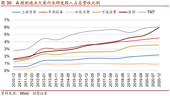 由于医药制造和TMT制造较为依赖于科研费用的投入以及大量科研人员的培养,这两个行业研发费用占营收比例已经提升至接近6%或以上,同时在过去数年间研发费用增速较快。其次是中游设备行业,其研发投入占总营收比例相比2010年提升了3个百分点至4.53%,主要体现在电气机械和器材制造业、仪器仪表制造业、通用设备制造、专用设备制造等板块研发投入力度持续增大。上游资源品、可选消费、必需消费板块研发投入占比也有一定的提升,但低于制造业整体的研发投入强度,这与行业属性和发展阶段具有较强的关系,研发资金投入依赖度相对较低。