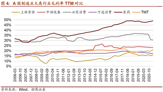 从行业结构上来看,近年来制造业内部行业毛利率变化较为多样,医药制造毛利率持续改善且远高于其他行业,上游资源、中游设备和必需消费均在2014年前后开启提升,可选消费和TMT毛利率表现较为平淡,但后者2019年以来出现上行。