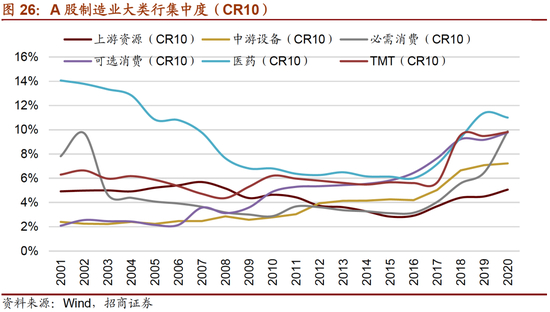 2011年至2015年上游资源品、必需消费、TMT制造、医药等行业集中度均出现不同程度下降,进入2016年后集中度企稳并出现明显上行。这与我国经济结构转型以及行业内优胜劣汰有较大的关系,2016年供给侧改革驱动多个行业进行多余产能去化,上游资源品和中游制造业在2016年-2018年行业集中度得到明显提升。同时伴随着消费升级以及居民可支配收入增多,消费行业集中度也出现迅速提升。