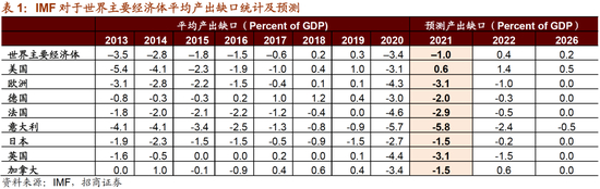 参考IMF,所有国家在2020年都出现了不同程度的负产出缺口。其中缺口较大的国家为意大利、法国、英国和欧洲地区。根据预测,这些国家在2021年和2022年的产出缺口虽然会有所缩小,但仍然为负值。