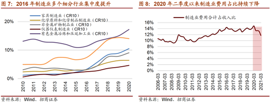 自2020年二季度开始,A股企业盈利进入新一轮上行周期,本次制造业净利率修复速度和上行幅度远高于A股整体(除金融石油石化)。除了行业集中度提升以外,本次费用率较大幅度下降为制造业利润释放创造较大的空间,目前制造业净利率已经攀升至6.9%(2021Q1)。由于目前费用率仍处于历史低位,尤其是企业借贷成本尚未出现明显上行,制造业仍可以享受一定的费用红利期,其净利率仍有一定的提升空间。