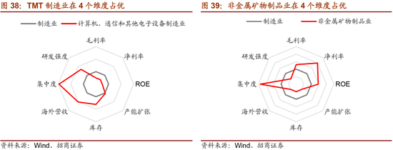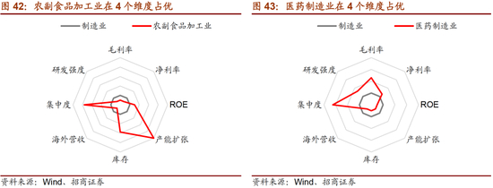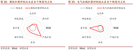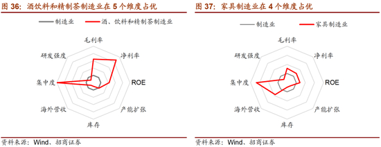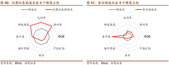 本章节将会构建八维度的综合评估体系,指标包括毛利率、净利率、ROE、产能周期、库存周期、海外营收、集中度、研发强度等。将A股整体制造业作为参考标准,测评各细分行业不同维度下财务指标大小占优情况,并采用雷达图的形式展示不同财务指标的优劣。