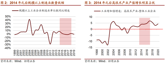 2014年后制造业开启快速上行通道可能与以下两方面原因相关:第一,2014年之后规模以上工业企业制造业数量增长逐渐趋于稳定甚至收缩,不少传统制造业企业经历了主动或者被动的出清过程。伴随着中小型企业退出市场以及落后产能淘汰,制造业向头部企业集中的现象越来越明显,竞争格局也开始优化,这也强化了龙头企业的议价能力和盈利水平。第二,高技术产业或高端制造业增长加快,制造业内部结构优化。对比整体规模以上工业企业和高技术产业工业增加值增速可知,后者在2014年之后增速明显加快,传统产业和新兴产业的差距开始拉大。