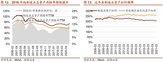 与整体A股(剔除金融石油石化)相比,制造业ROE明显占优的阶段为2017Q1-2019Q1和2020Q2至今,这与制造业净利率占优阶段基本一致,即ROE提升的正向驱动力之一来自于净利率。与此同时,制造业总资产周转率出现较大幅度提升,行业竞争格局优化叠加需求持续好转,制造业产能利用率自2016年初开启上行,且相比整体A股的优势愈发明显。在制造业ROE持续提升阶段,资产杠杆反而呈现逐渐企稳甚至微降的趋势,说明制造业依赖加杠杆的行为明显收敛,更多的依赖于内生增长动能。