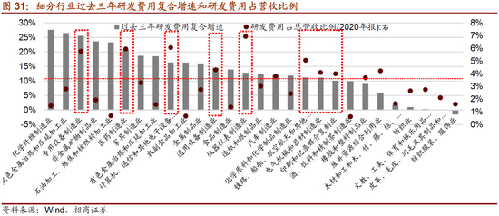 ⚑制造业研发强度持续提升。研发投入占总营收的比例已经快速提升至3.63%(截至2020年报),仅少部分行业如纺织服装等研发费用增速低迷以外,绝大多数行业过去三年研发费用复合增速保持在10%以上。