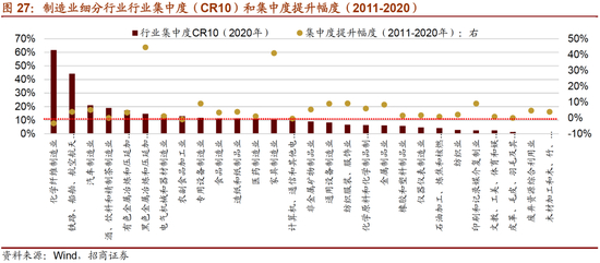 过去十年(2011年-2020年)制造业中绝大多数行业集中度出现不同程度提升,提升较快的行业依次是黑色金属冶炼和压延加工业、家具制造业、纺织服装服饰业、印刷和记录媒介复制业、专用设备制造业、通用设备制造业、金属制品业。近年来制造业集中度普遍提升主要是受到以下三方面的驱动: