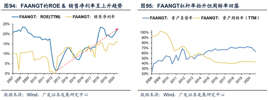 美股FAANG的ROE持续走高,热门股“抱团”根本上来源于利润率持续改善。FAANGT的ROE自2012年以来得到显著提高,基于杜邦三因素拆解,ROE的提高主要由销售净利率贡献,二者走势高度相关。而ROE的增幅则受资产周转率下降拖累。我们认为:相较杠杆率和周转率的窄幅波动,ROE的持续走高主要是由利润率驱动的。