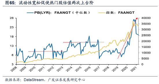 08年金融危机后和20年疫情后的两次大宽松,进一步推动美国热门抱团股估值两次上台阶。2008-2014年三轮PE促使全球资金回流美国,被动资金加速入场,美股估值水平持续上行,以FAANGT为代表的优质龙头估值抬升。2020年疫情期间美联储重启零利率+QE,缓解流动性危机,以FAANGT为代表的科技股受益于免疫及流动性宽松预期,估值大幅抬升,持续领涨。美国持续宽松的货币政策向市场注入了大量的流动性,夯实了热门股抱团向上的基础。