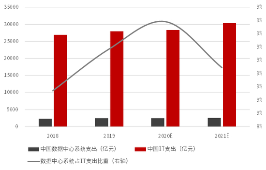 根据Gartner公布的初步数据显示,2018-2020年,数据中心系统支出占IT支出比重逐年提升。2020年中国IT支出达到2.84万亿,其中数据中心系统支出2508亿元,占IT支出比重达8.85%。