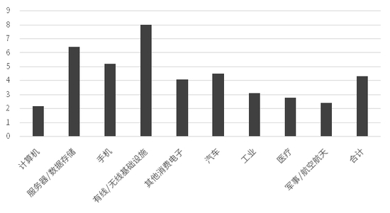 据 Prismark 数据,2018年全球PCB增长 6%,其中服务器/数据中心领域同比增长 21.3%,预测2018-2023 年全球 PCB市场整体增速为 3.7%,其中服务器增速为5.8%,明显快于行业平均增速。
