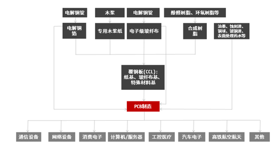 PCB产业链的上游为覆铜板CCL,而中游则为PCB的制造环节,产业链下游对接终端设备,覆盖领域极为广阔,包括通信、计算机、消费电子和汽车电子等。