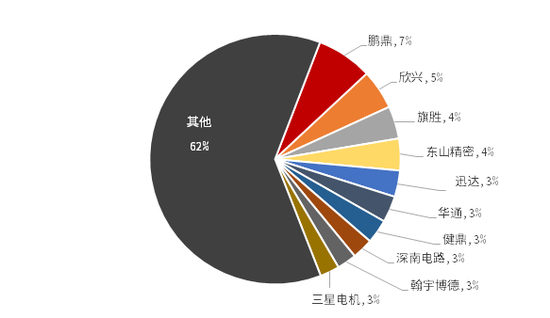 中游PCB厂商竞争充分,CR5仅为20%,CR10为38%,竞争格局相对CCL而言较为分散。