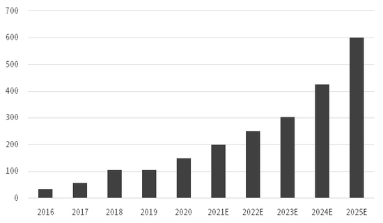 据测算,2025年国内新能源乘用车销量有望达到600万辆,2020-2025 年复合增速约为32%。