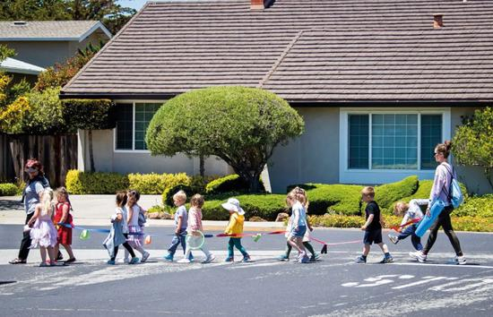 2 0 2 1 年 6 月 1 5 日 ,在 美 国 加 利 福 尼 亚 州 旧 金 山 ,小 朋 友 在 老 师 带 领 下 出 游 。当 日 ,美 国 加 州 解 除 防 疫 等 级 限 制 的 相 关 规 定 ,全 面 恢 复 开 放 经 济 活 动 。图 / 新 华