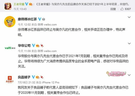 19日稍早,华帝公司发文称与吴亦凡代言合作已于2021年7月到期,相关宣传合作已完成及终止。康师傅冰红茶发布声明称,“已终止与吴亦凡的代言合作,相关手续正在办理中”。