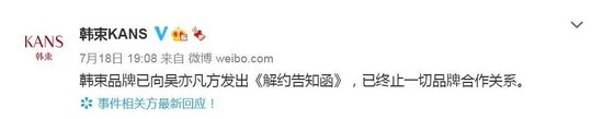 7月18日19时8分,韩束官方微博发文称,已向吴亦凡方发出《解约告知函》,已终止一切品牌合作关系。这是吴亦凡被都美竹爆料后,首个明确提出解约的品牌。“韩束与吴亦凡解约”迅速登上微博热搜。