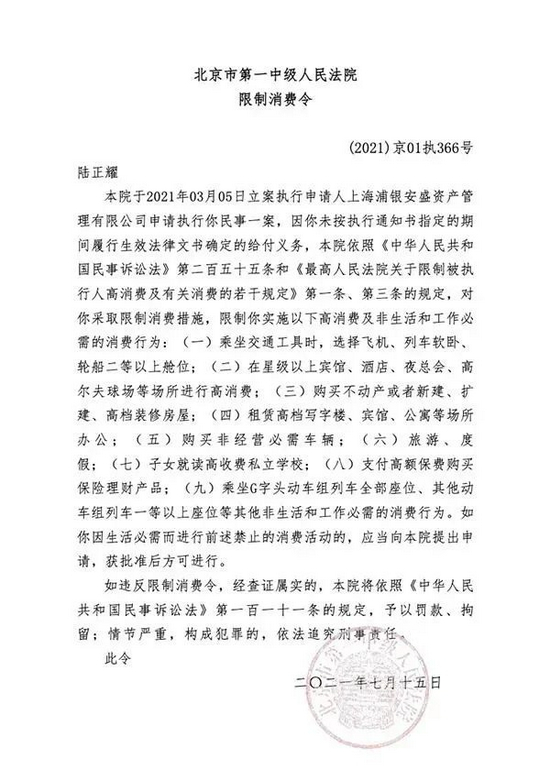 7月19日,记者从中国执行信息公开网获悉,7月15日,陆正耀新增一则限制消费令信息。申请人为上海浦银安盛资产管理有限公司,发布法院为北京市第一中级人民法院。关联执行案件立案时间为2021年3月5日,执行标的超过9.35亿元。
