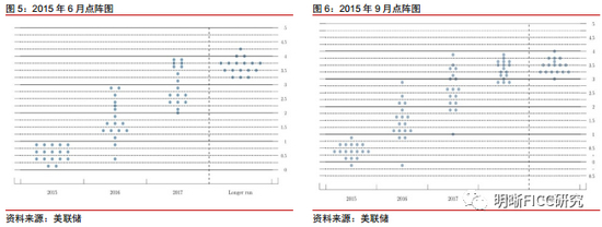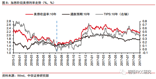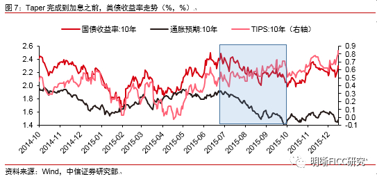 在Taper完成到开启加息之前的时间里,美债收益率宽幅震荡。在2014年10月美联储宣布Taper完成之后,由于美联储短时间内没有给出明确的加息信号,同时再投资MBS和展期国债保持流动性宽松,导致美债利率在这段时间内宽幅震荡。在此阶段,除了6月-10月美债收益率跟随通胀预期下行之外,其余时间内实际利率仍是影响美债收益率走势的主要因素。在6月议息会议后,点阵图暗示美联储或在年内加息,通胀预期快速下行,带动美债收益率在实际利率走高的情况下下行。