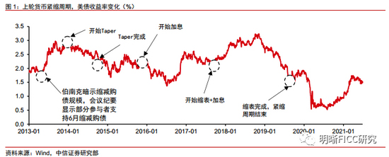 回顾上一轮紧缩周期:2013年5月美联储首次释放了Taper信号,在Taper信号释放和讨论阶段,美债收益率明显上行。2013年12月美联储宣布于2014年1月Taper,在Taper实施阶段,美债收益率明显下行。2014年10月美联储宣布Taper完成并对到期的MBS和国债再投资,美债收益率宽幅震荡。2015年12月正式开启加息,美债利率先下后上。2017年9月美联储宣布10月开启缩表,在缩表阶段,美债收益率先上后下。